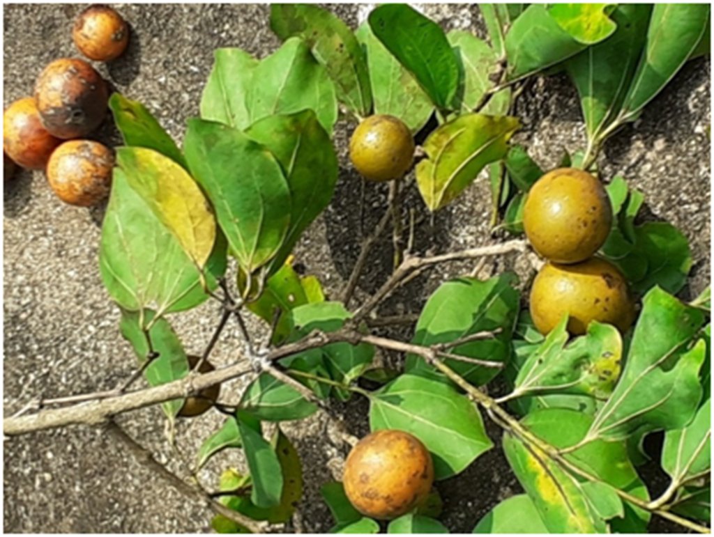 It is a medium sized tree, botanically called Strychnos nux-vomica, belonging to the natural order of Loganiaceae. The plant is first described by Linneaus, a well-known botanist in 1753. In Tamil it is called Yetti or Kanjaram. The medicine, nux vomica is prepared from the seeds which are very bitter and contain Strychine and Brucine. The ash-grey circular seeds remain in the fruit which is very much like a ripe orange, in colour and appearance.
