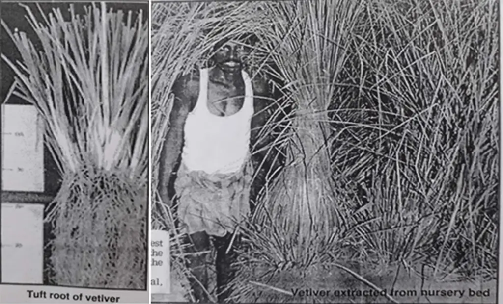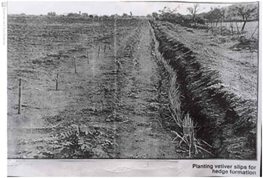 A vetiver hedge is key to the in-situ moisture conservation in rain-fed farming system. It serves as a guideline for oil ploughing and planting on the is contour and, in times of heavy er rain and storms, prevents K largescale erosion.Vetiver grows in all types of 12- soil and in a wide range of climatic conditions. Its propagation is easy. The superior cultivar should be collected to raise nursery. In Karnataka, six cultivars have been identified. One cultivar exhibits superior characteristics for hedge formation, fodder, and insect-disease and, drought-resistance.
